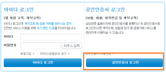 저는, 삼성생명에 가입된 상품으로 받았었는데요. 타사에 가입된 상품도 비슷한 방법으로 이용 또는 상환이 가능합니다. 먼저 가입된 아이디 또는 공인인증서로 로그인을 합니다.