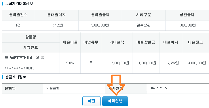 상환할 때에도 전액 또는 일부를 선택할 수 있으며 저는 총 500 만원 중, 100 만원과 이자 17,452원을 정산하기로 하였습니다. 원금을 입력하고 출금 계좌를 선택하면 됩니다.