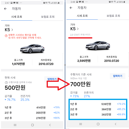 초기 500만원에서 이제는 700만 원으로 나오고 감가율 73%로 잔존가치가 27%밖에 남지 않은 것으로 나왔습니다. 그리고 앞으로 3년 후면 초기 차값의 10% 수준밖에 안된다는 예상금액도 확인이 가능합니다.
