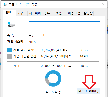그 다음 속성 하단에 "디스크 정리" 버튼을 클릭합니다.