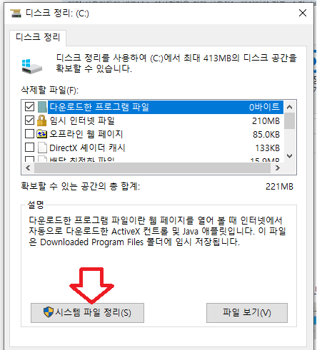 디스크 정리에 삭제할 파일 목록이 나오는데요. 여기에서는 old파일 목록이 나타나지 않고, 하단에 "시스템 파일 정리" 버튼을 클릭해야 합니다.