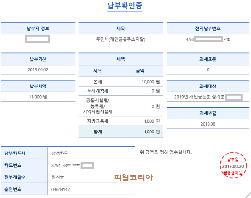 최종적으로 결제가 완료된 후, "납부확인증"을 즉시 확인할 수 있습니다. 위택스 홈페이지 또는 어플을 이용할 때의 장점은 과거 납부했었던 확인증을 5년 동안 언제든지 확인이 가능하다는 점입니다.