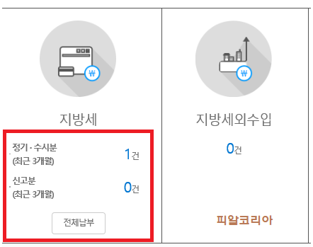 정상적으로 로그인이 되었다면, 위에서 보시는 것처럼 본인이 납부해야 할 지방세 건수가 보입니다. 제 기준으로 정기. 수시분 1건이 보입니다.