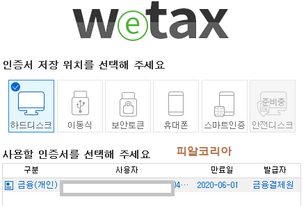 저 같은 경우에도 일반적으로 인터넷뱅킹용으로 무료 발급받은 인증서를 통해 로그인을 하였습니다.