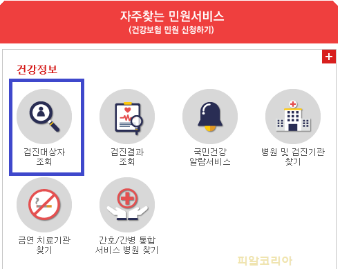 건강보험공단 홈페이지에 접속하신 후, 자주 찾는 민원서비스 중, 건강검진 대상자 조회 메뉴를 클릭하여 이동합니다. 그리고 공인인증서를 통해 로그인을 합니다.