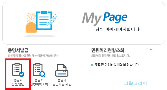 정상적으로, 로그인이 되었다면 "증명서 신청/발급" 메뉴를 클릭합니다.
