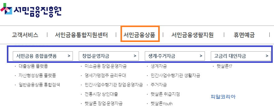 홈페이지 상단 메뉴에서 "서민금융상품"을 클릭한 후, 창업. 운영, 생계. 주거, 고금리 전환자금 등을 선택합니다.