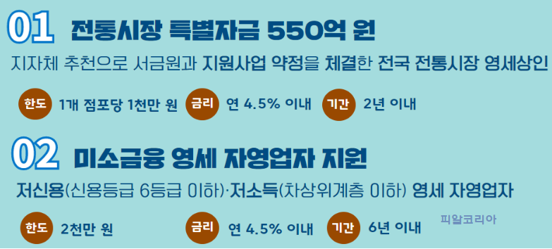 첫 번째, 전통시장 특별자금 550억 원이 지원되며, 지자체 추천의 서민금융진흥원과 지원사업 약정을 체결한 전국의 전통시장 영세상인들에게 1개 점포당 연 4.5% 이내로 최대 1천만 원을 지원해주는 제도입니다.