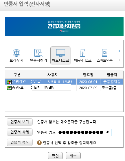 공인인증서는 기존에 본인이 인터넷뱅킹용으로 사용하던 무료 인증서로 이용이 가능하며, 인증서가 없는 경우엔 거래하시는 은행 사이트에서 무료로 발급받아 이용하시면 됩니다.