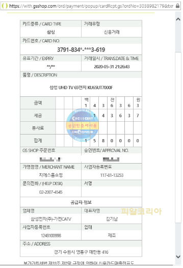 영수증의 경우 거래 사이트에서 출력이 가능하며 위와 같이 공급자의 정보, 가맹점 정보가 나와 있어야 합니다.