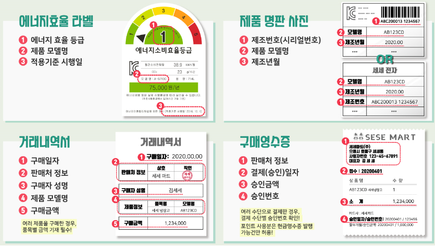 우선, 본인이 구입한 제품의 뒷면 등에서 에너지 효율 라벨을 찾아 사진 촬영, 그리고, 제품의 제조년월과 시리얼 번호 등이 나온 사진, 구입한 사이트 또는 매장에서 발급한 거래내역서, 구입한 영수증을 사전에 준비하셔야 합니다.