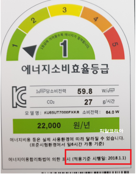 제가 구입한 TV의 1등급 사진입니다. TV의 경우 1등급 제품만 해당이 되며, 기준 시행일은 2018년 1월 1일부터이기 때문에 해당이 된 것을 알 수 있습니다.