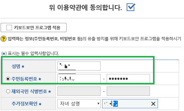 그다음 페이지에서 신청자의 성명과 주민번호, 추가 정보 확인을 위한 자녀 또는 부, 모, 배우자의 이름을 입력한 후 진행하시면 됩니다.