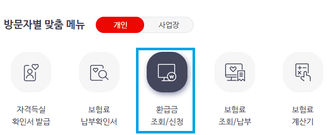 먼저, 공단 홈페이지에서 인증서나 개인아이디를 통해 로그인을 한 후, "환급금 조회/신청" 메뉴를 클릭합니다. 로그인 인증이 된 경우, 바로 결과 확인이 가능합니다.