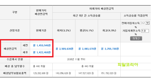 위 표에서 보시는 것처럼 예상연금액 부분에서 세전과 세후 금액이 현재 소득 기준으로 매월 받을 수 있는 금액이라고 이해하시면 됩니다.