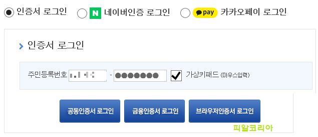 그다음 단계로, 인증 부분에서는 공동인증서 또는 기타 다른 방법으로도 로그인하신 후 이용할 수 있습니다. 저는 인터넷뱅킹용 인증서가 있어 공동인증서로 로그인을 하였습니다.