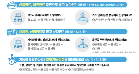 그다음 지역화폐 선불카드나 상품권으로 받고 싶은 경우엔 지자체별 별도 홈페이지에서 5월 18일부터 신청 가능합니다.