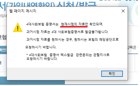 그리고, 참고로 알아두셔야 하는 것으로 이 사이트에서는 현재시점의 자료만 확인이 되고, 과거 가입 이력이나 과거 시점의 가입자 명부는 공단콜센터나 각 지사에 보험별로 각각 신청하셔야 합니다.