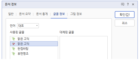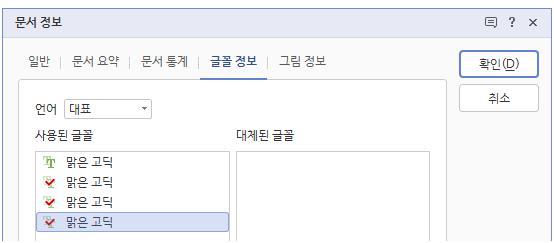 2. 문서정보 창에서 "글꼴정보" 탭을 클릭합니다. 위 화면에서 보시는 것처럼 사용된 글꼴이 현재 문서에서 사용되는 글꼴입니다.