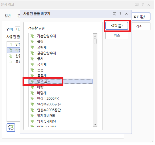 3. 이어서 바꾸고 싶은 글꼴을 선택한 후 "설정" 을 클릭하시면 됩니다. 저는 모두 "맑은 고딕"으로 진행했습니다.