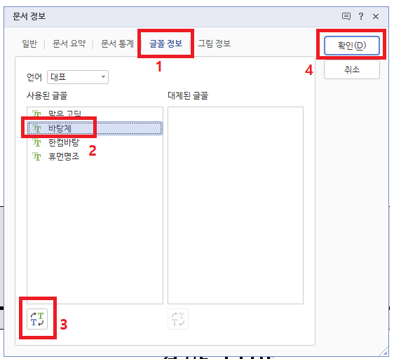 본인이 바꾸고자 한 글꼴을 모두 바꾸셨다면 문서정보창의 "확인"만 클릭하시면 됩니다.