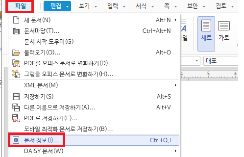 1. 한글을 실행하신 후 "파일" -> "문서정보"를 클릭합니다. 또는 단축키로 Ctrl+Q,I키를 동시에 누르셔도 됩니다.