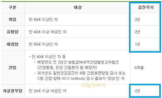 위암과 유방암은 만 40세 이상은 2년 주기로 시행되며, 대장암은 만 50세 이상부터 1년 주기로 시행이 됩니다. 단, 간암의 경우 만 40세 이상중 고위험군 등은 6개월마다 시행되고 있습니다.