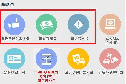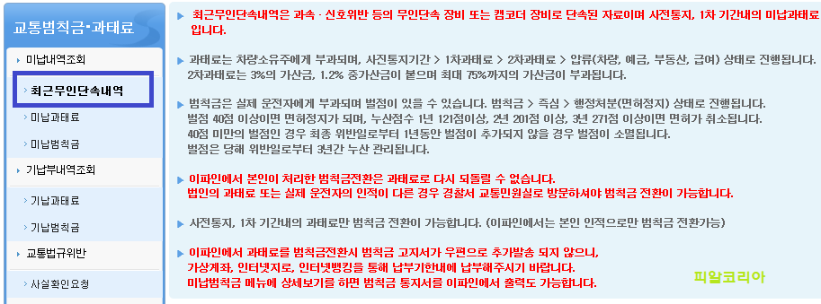 홈페이지에 접속하시면 위 이미지와 같이 최근 무인단속내역과, 미납과태료, 미납 범칙금 등 바로가기 링크를 통해 이동하시면 됩니다.