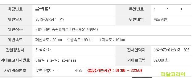 상세보기에는 구체적인 위반일시와 속도 초과, 금액, 그리고 차량번호가 찍힌 전면 사진도 함께 확인이 가능합니다. 저는 다행히 초과속도가 20km 미만이어서 32,000원이 부과된 상태입니다.