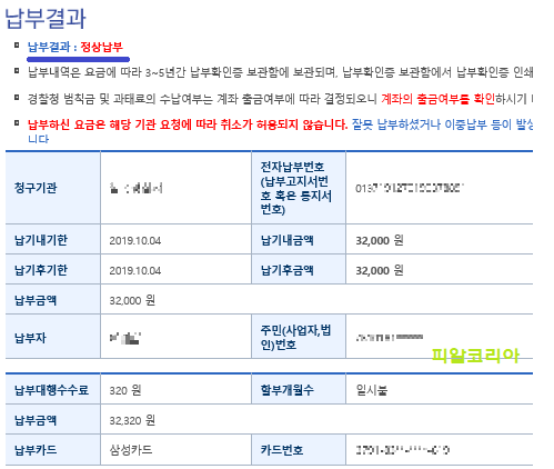 저는 신용카드를 통해 즉시 납부했으며, 이파인에서 과거에 기납부한 내역도 함께 조회하실 수 있습니다. 그리고, 본인이 1차 과태료분에 대해 수긍하지 못할 경우엔 과태료 조회납부시스템 "민원신청" 메뉴를 통해 이의신청 또는 의견진술도 온라인으로 진행하실 수 있습니다. (발부 일자로부터 10일 이내)