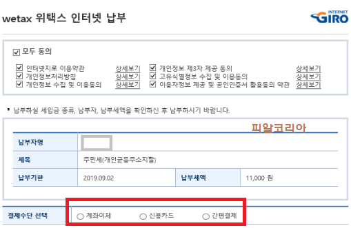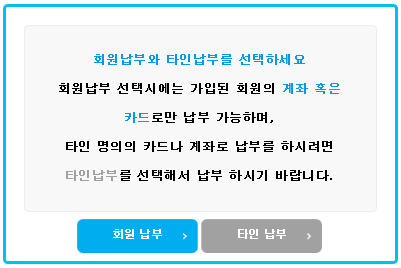 납부 방법은 회원, 타입 납부가 있으며 신용카드로 결제를 원할 경우엔 "회원 납부"를 선택하여 진행합니다.