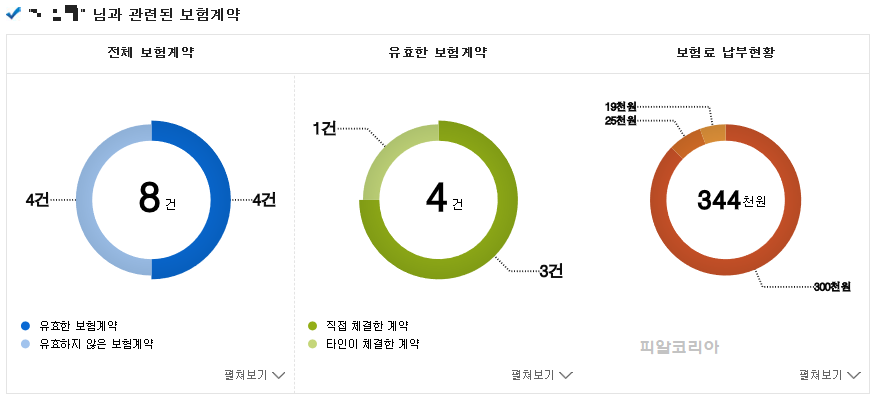 전체 계약 건수와 유효한 건수, 그리고 매월 납부하고 있는 보험료 금액을 일괄적으로 확인할 수 있으며, 본인이 체결한 계약 이외 단체상품 등 타인이 체결한 계약까지 조회가 됩니다.