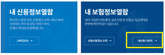 조회 방법은 간단합니다. 공식 홈페이지에 접속하신 후, "내 보험 정보열람" 부분에서 내보험다보여를 클릭한 후 이동하시면 됩니다.