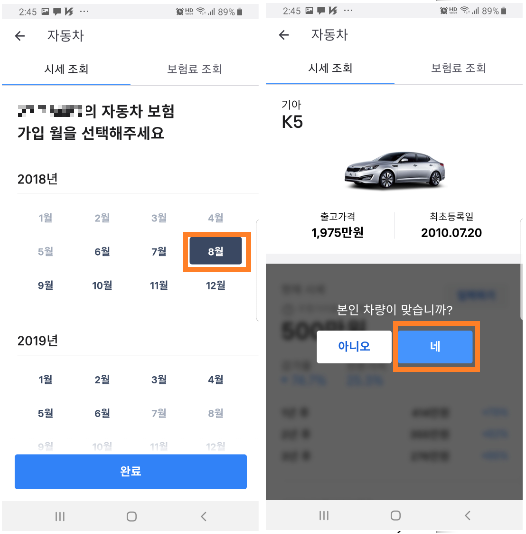 그다음 단계로 자동차보험 가입월을 선택합니다. 저는 돌아오는 8월이 갱신 월이기 때문에 2018년 8월을 선택했습니다. 위에서 보시는 것처럼, 본인의 차량의 출고 가격과 최초 등록일이 자동조회되어서 나옵니다.
