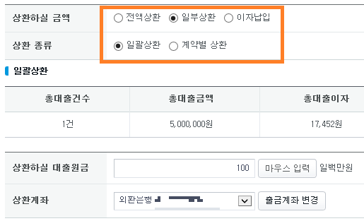 상환할 때에도 전액 또는 일부를 선택할 수 있으며 저는 총 500 만원 중, 100 만원과 이자 17,452원을 정산하기로 하였습니다. 원금을 입력하고 출금 계좌를 선택하면 됩니다.