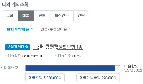 로그인을 하면 위 화면과 같이 나의 계약조회에 들어가면 현재 받은 잔액과 이용 가능한 금액이 나오게 됩니다. 사실 위 상품은 제가 2010년도에 가입하고 이미 납입은 끝난 상품인데 보시는 것처럼 이율이 9.8%로 엄청나게 비쌉니다. 내가 가입한 상품으로 해약 범위 내에서 받는 것인데 거의 10%에 가까운 이자를 내고 돈을 빌린다는 것이 억울하긴 하지만 그래도 어쩔 수가 없네요.
